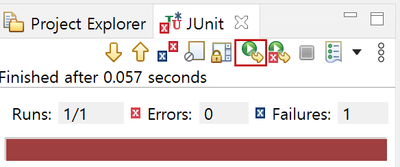 6. 다시 테스트를 실행하기 위해 "JUnit"탭에 있는 툴바에서 "Rerun Test"버튼을 클릭합니다.