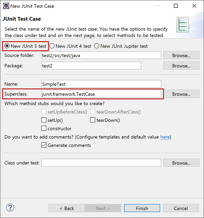 만약 "New JUnit 3 test"를 선택하였다면 "Superclass"가 "junit.framework.TestCase"으로 위에서 설명드린 것처럼 상속받아야 합니다. 그리고 "setUpBeforeClass()"과 "tearDownAfterClass()"는 지원하지 않습니다. 그러나 "constructor"는 지원합니다.