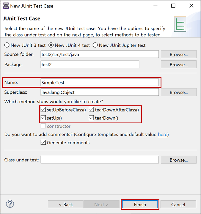 "Class under test"는 테스트할 클래스를 지정합니다.