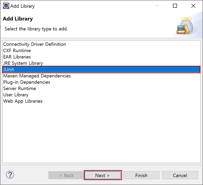 "Add Libray"창에서 "JUnit"를 선택하고 "Next"버튼을 클릭합니다.