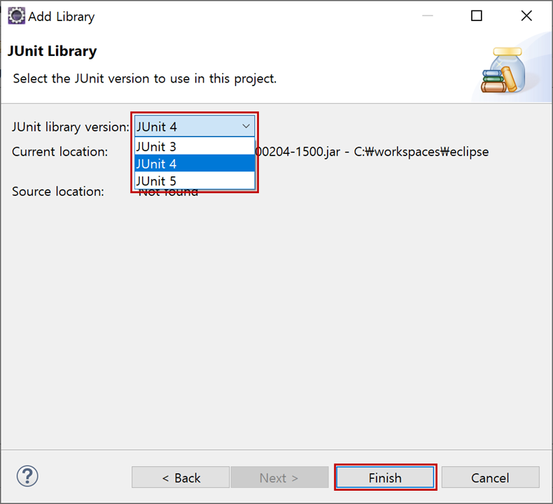 "JUnit Library"창에서 "JUnit library version"을 "JUnit 4"로 선택하고 "Finish"버튼을 클릭합니다.