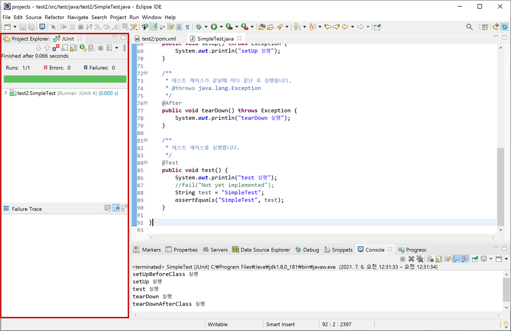 "SimpleTest"가 다시 실행되면서 "Failures"이 "0"이 나오고 성공합니다. 테스트 실패가 없을 경우 적색바에서 녹색바로 변경됩니다.