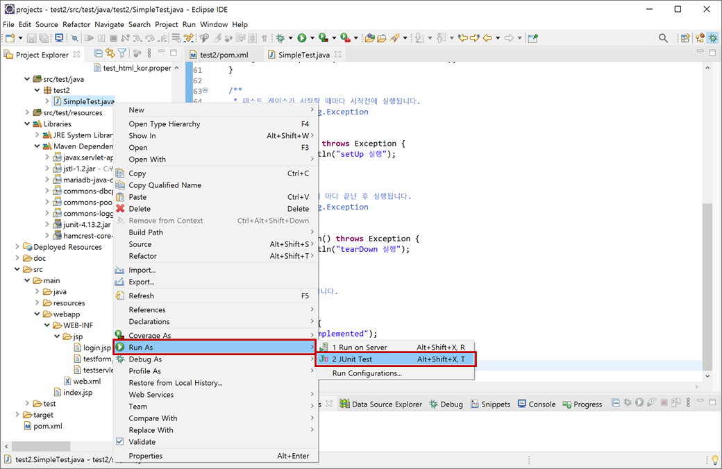 4. "test2" 프로젝트의 [Java Resources > src/test/java]에 있는 "test2 > SimpleTest.java"에서 마우스 오른쪽 버튼을 클릭하여 콘텍스트 메뉴에서 [Run As > JUnit Test]를 클릭합니다.