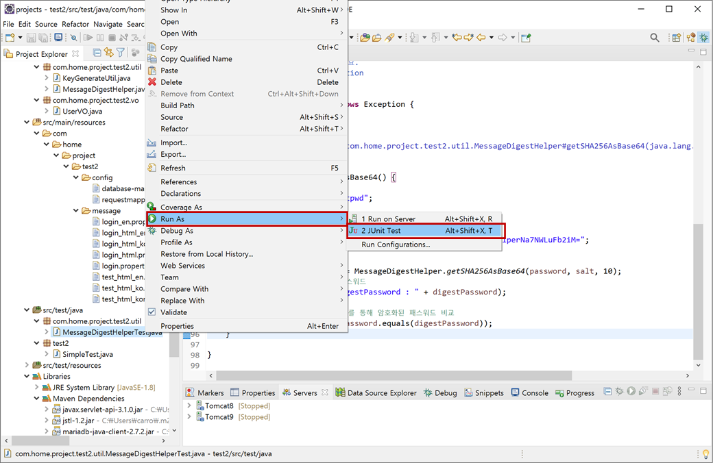 3. "test2" 프로젝트의 [Java Resources > src/test/java]에 있는 "com.home.project.test2.util > MessageDigestHelperTest.java"에서 마우스 오른쪽 버튼을 클릭하여 콘텍스트 메뉴에서 [Run As > JUnit Test]를 클릭합니다.