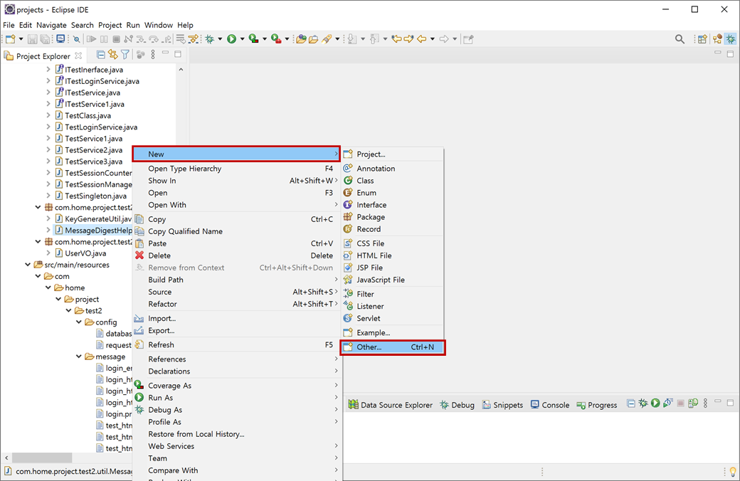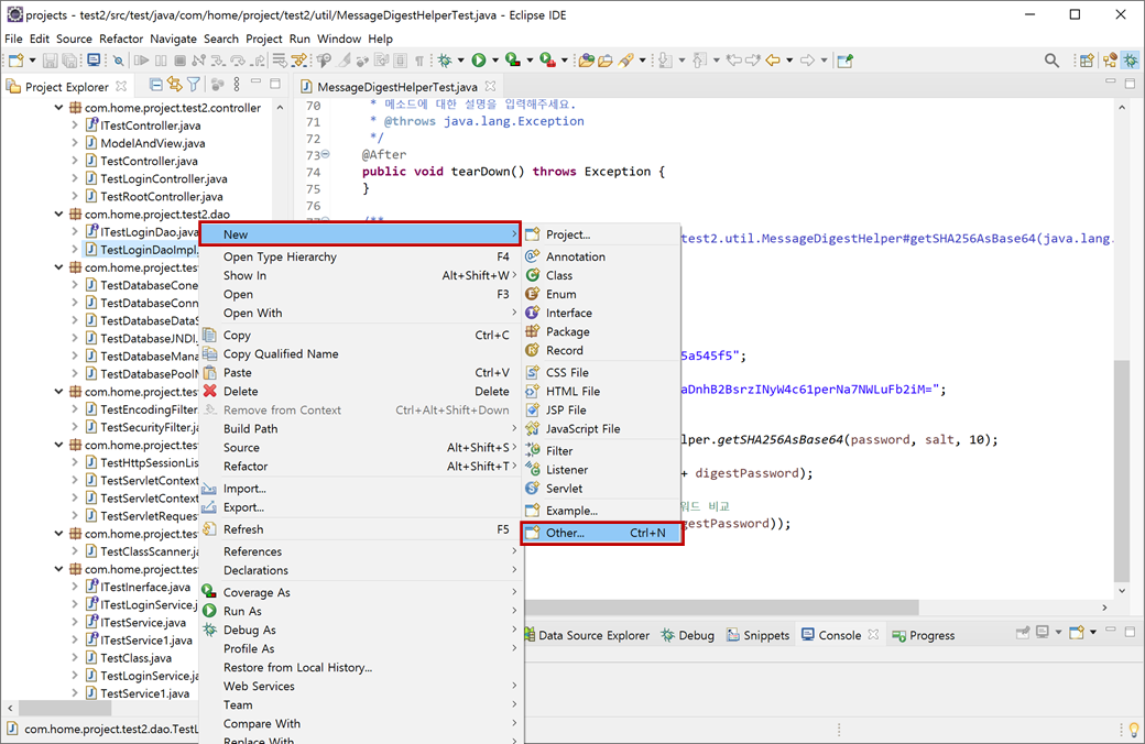 1. "test2" 프로젝트의 "Java Resources/src/main/java"에서 "com.home.project.test2.util.MessageDigestHelper.java"를 선택하고 마우스 오른쪽 버튼을 클릭하여 콘텍스트 메뉴에서 [New > Other...]를 클릭합니다.