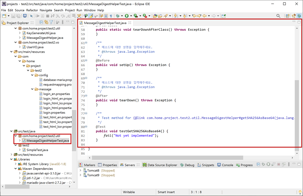 "test2" 프로젝트의 [Java Resources > src/test/java]에 "com.home.project.test2.util > MessageDigestHelperTest.java"가 생성됩니다.