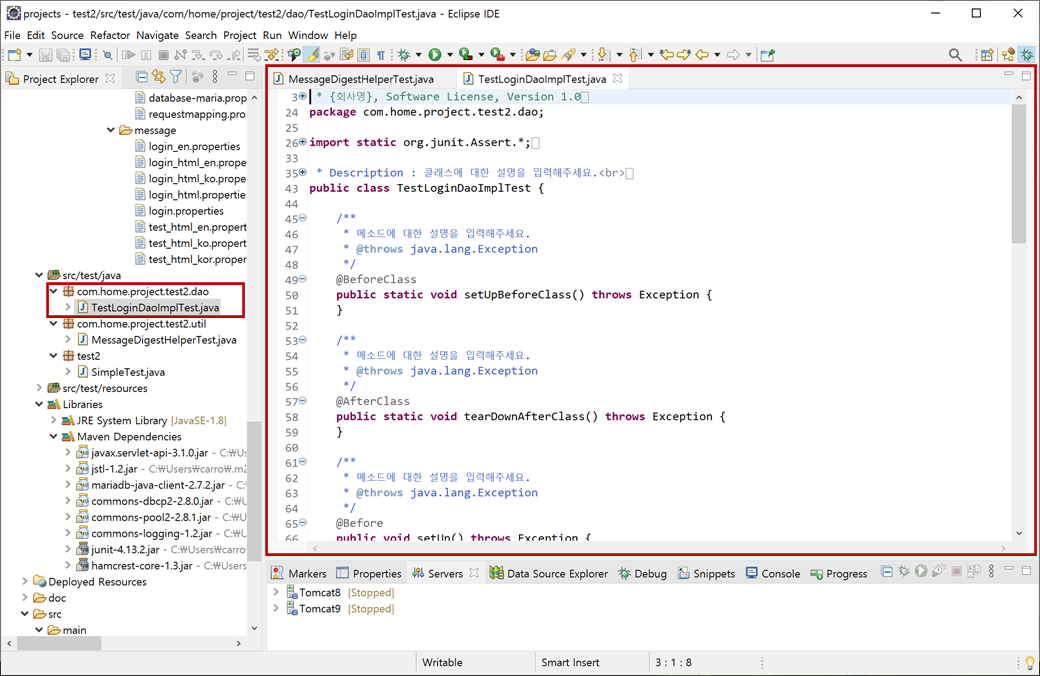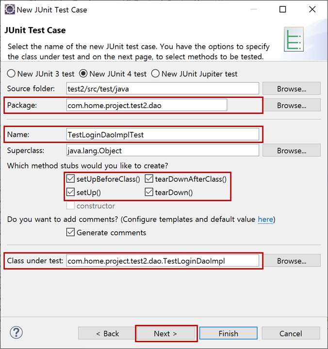 "test2" 프로젝트의 [Java Resources > src/test/java]에 "com.home.project.test2.dao > TestLoginDaoImplTest.java"가 생성됩니다.