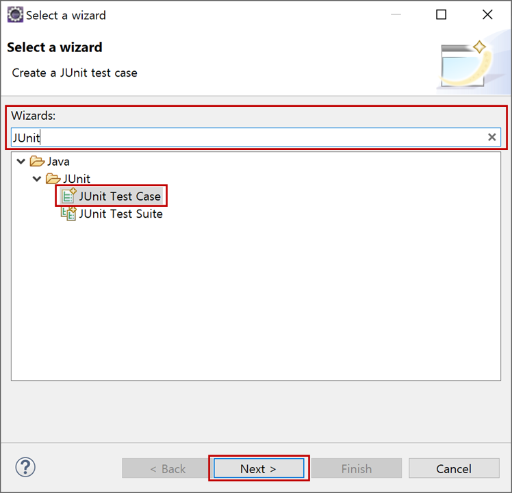 2. "Select a wizard"창에서 "Wizards"에 "JUnit"을 입력하고 "JUnit Test Case"를 선택한 후 "Next >"버튼을 클릭합니다.