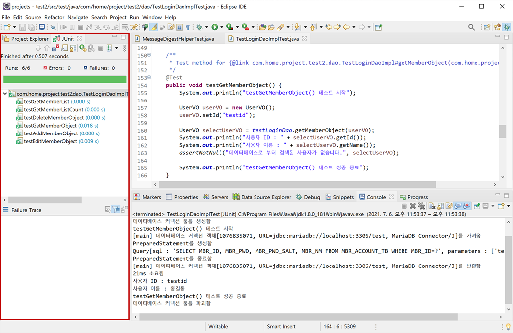 실제로 DAO객체의 메서드가 정상적으로 동작하는지 테스트로 확인하겠습니다.