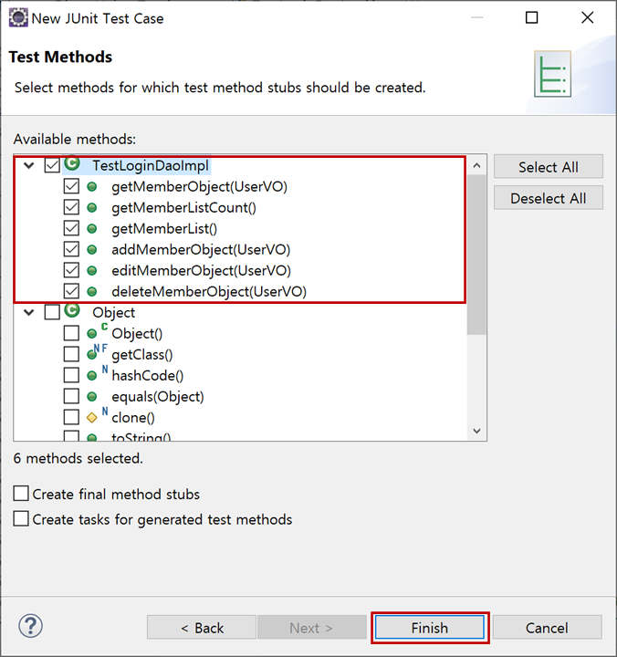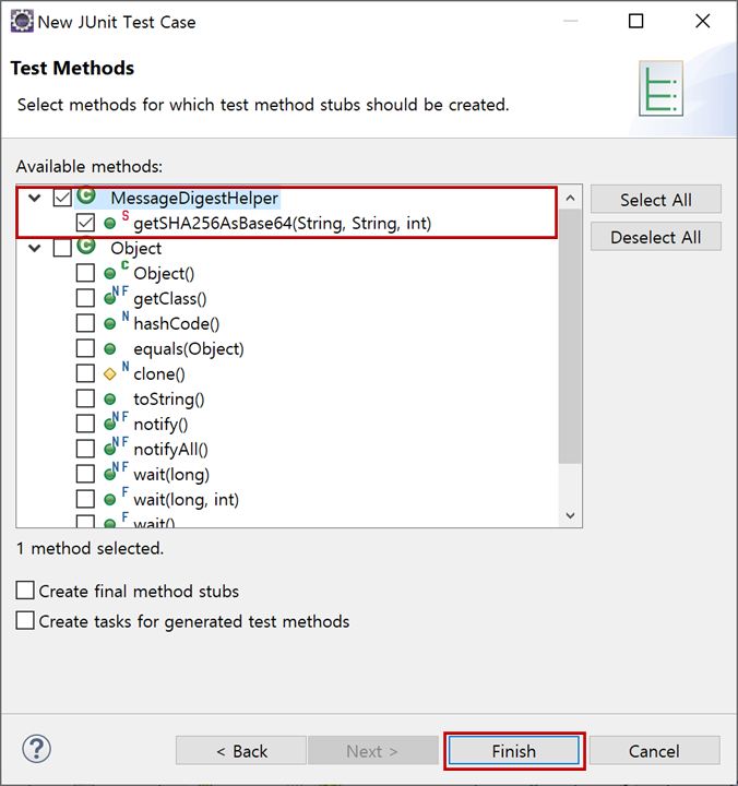 "Test Methods"창에서 단위 테스트할 메서드를 선택하고 "Finish"버튼을 클릭합니다.
