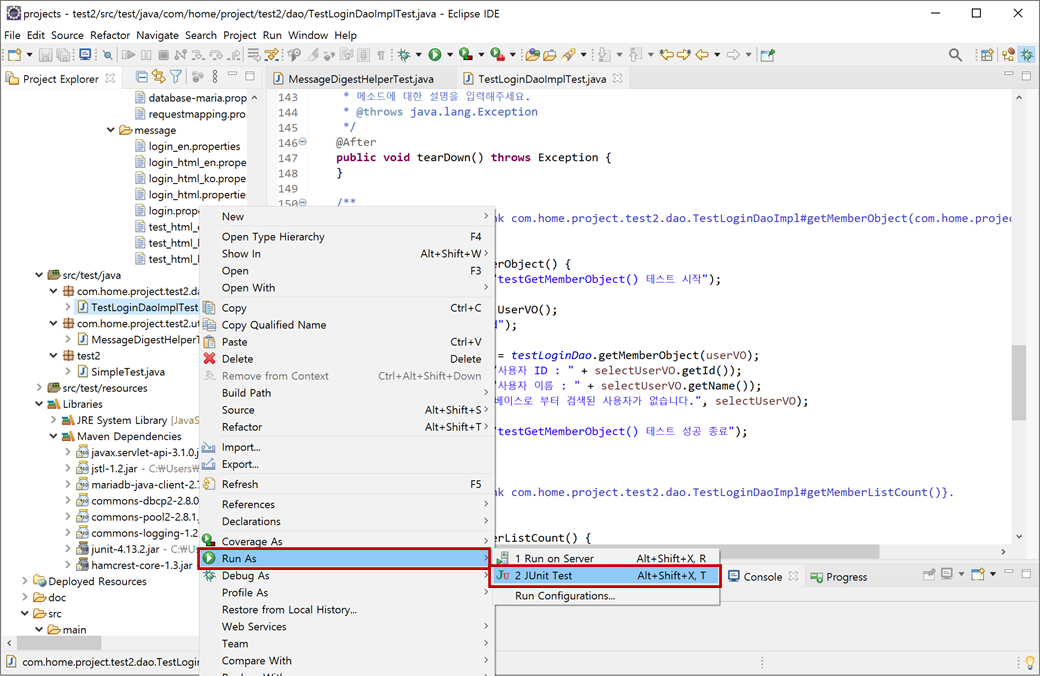 3. "test2" 프로젝트의 [Java Resources > src/test/java]에 있는 "com.home.project.test2.util > TestLoginDaoImplTest.java"에서 마우스 오른쪽 버튼을 클릭하여 콘텍스트 메뉴에서 [Run As > JUnit Test]를 클릭합니다.