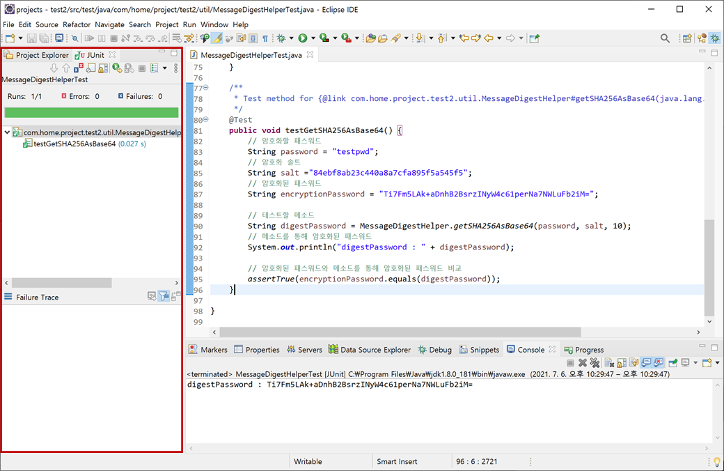 그 당시 사용했던 패스워드와 Salt(솔트), 암호화된 패스워드를 가지고 "MessageDigestHelper"의 "getSHA256AsBase64()"메서드가 정상적으로 동작하는 테스트하기 위해 다음과 같이 "testGetSHA256AsBase64()"메서드를 수정합니다.