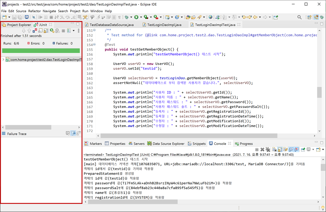 3. 이전 "자바 JUnit를 이용한 단위 테스트"에서 추가한 "TestLoginDaoImplTest.java"에서 테스트 케이스인 testGetMemberObject()메소드에서 getMemberObject()메소드를 실행할 수 있게 수정합니다.